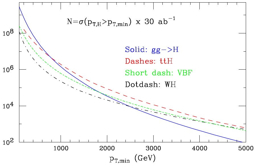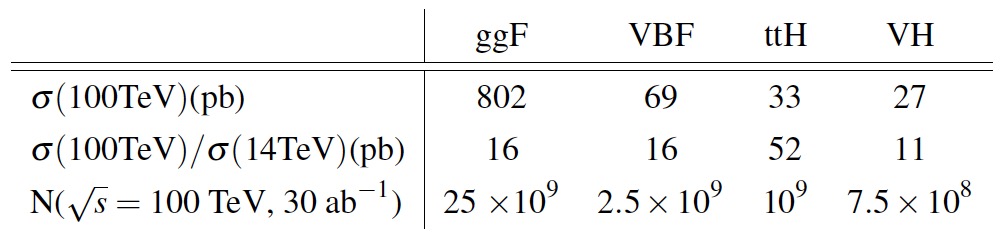 Upper row: Cross sections at 100 TeV for the production of a SM Higgs boson in the gluon fusion (ggF), vector boson fusion (VBF), top pair associated (ttH) and Higgs-strahlung (VH) production modes. Middle row: Rate increase at 100 TeV relative to 14 TeV. Lower row: Expected number of Higgs bosons produced with an integrated luminosity of $30 ab^{-1}$. [11]