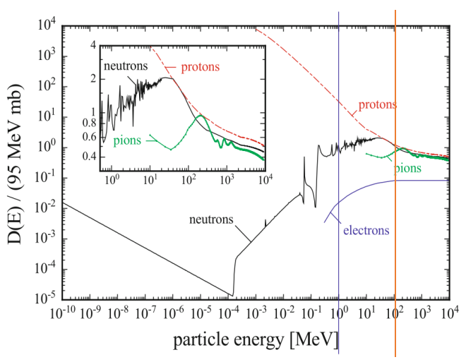 \[\Phi_{e q}=\kappa \Phi=\kappa \int \phi(E) d E ; \quad\left[\Phi_{e q}\right]=n_{1 \mathrm{MeV}} / \mathrm{cm}^{2}\]Such as 100 MeV proton equivalent fluences[3]