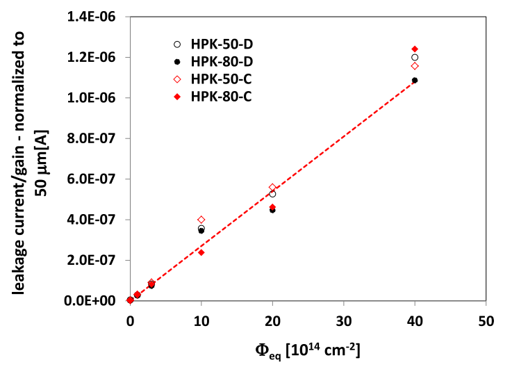 \[\frac{\Delta I (\Phi_{eq})}{V} = \alpha \Phi_{eq} \times M_{I}(\Phi_{eq}, V_{bias})\]where \(M_{I}(\Phi_{eq}, V_{bias})\) is residual gain in irradiated LGAD. Fig.3[5] shows a good linear relation in measurements for irradiated LGAD based on corrected relation of leakage current.