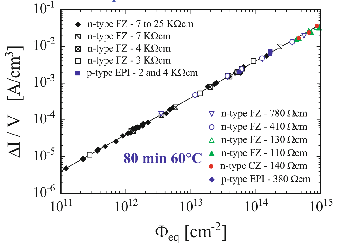 \[\frac{\Delta I (\Phi_{eq})}{V} = \alpha \Phi_{eq}\]where \(V\) is active region volume, \(\Delta I = I(\Phi_{eq}) - I(unirradiated)\) is the leakage current increase caused by irradiation. \(\alpha\) is called the current-related damage rate. As Fig.2[4] shows the leakage current in various silicon detectors, \(\alpha=(3.99\pm0.03)\times10^{-17}\) A/cm which measurements taken at 20\(^{\circ}\)C after a standard annealing process 80min@60\(^{\circ}\)C.